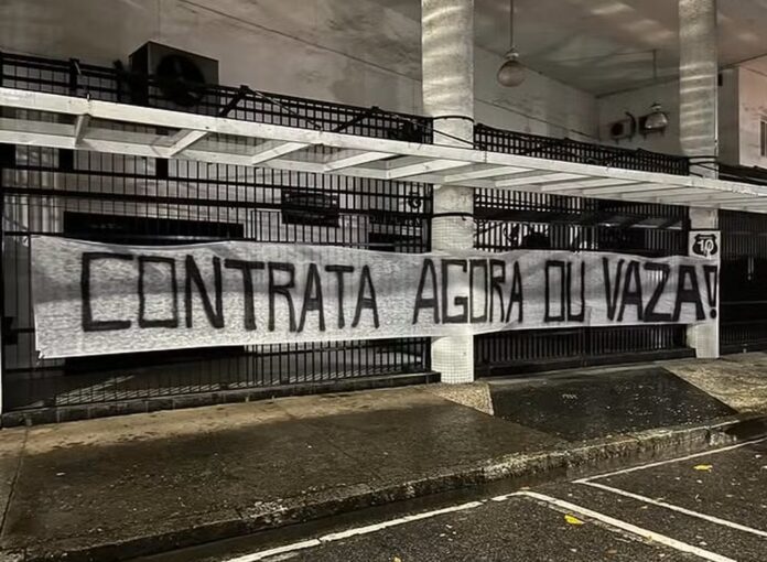 Torcedores estenderam faixas com cobranças nos últimos dois dias, ambas direcionadas para a gestão. Na Vila Belmiro, o recado cobrava a falta de reforços: “Contrata agora ou vaza”, dizia a faixa exposta na noite desta segunda-feira e retirada minutos depois por funcionários do clube.