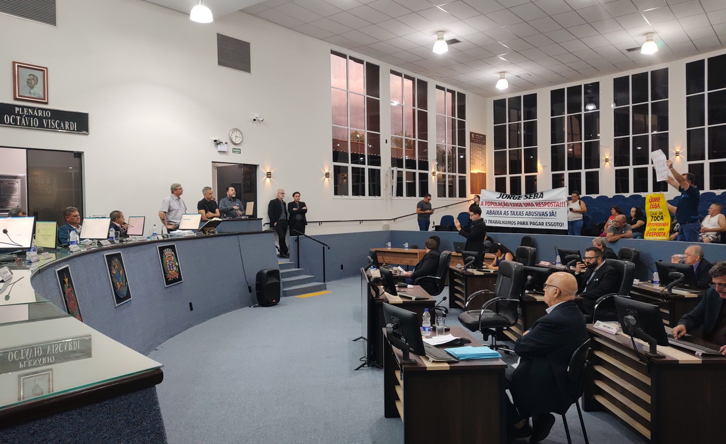 No plenário, participantes do protesto cobravam pelo realinhamento da tarifa de esgoto, além do fim ou reestruturação da polêmica ‘Taxa do Lixo’, aprovada em dezembro de 2024 e que atingiu 50% da cobrança em 2026. Entretanto, esse tópico não foi abordado.