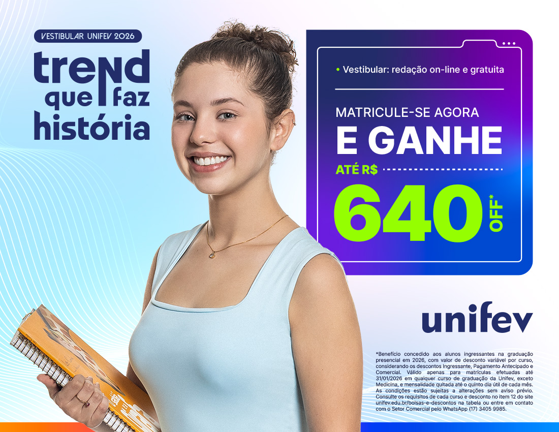 O Vestibular Unifev 2026 permanece com inscrições abertas. O processo seletivo é 100% on-line e gratuito, composto apenas por uma redação, permitindo que o candidato participe de onde estiver, com praticidade e acessibilidade.