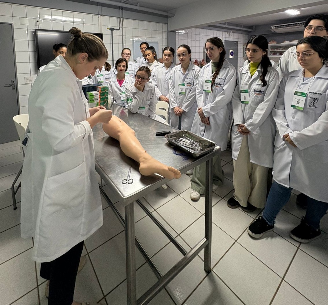 O encontro, realizado no Laboratório de Anatomia do câmpus Centro, teve como tema “Introdução às técnicas de sutura” e foi conduzido pela Profa. Ma. Juliana Corrêa Meziara de Castro. Durante o workshop, os participantes puderam revisar os conceitos fundamentais de técnicas operatórias, conhecer mais sobre o manuseio correto dos instrumentais cirúrgicos básicos e aplicar, na prática, diferentes técnicas de sutura em modelos simulados.