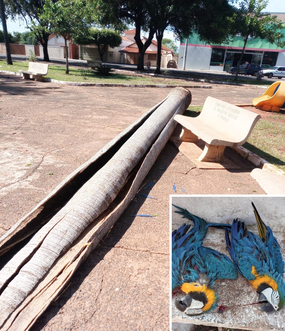 As araras moravam em um coqueiro na praça que foi arrancado pela força do vento. Pelo menos três casas foram destelhadas e uma família precisou ser realocada.