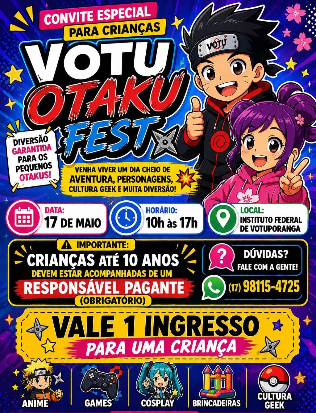 O Votu Otaku Fest, já consolidado como um dos principais eventos de cultura pop do interior paulista, anuncia uma ação de alcance social que reposiciona o acesso ao festival: a distribuição de 4 mil ingressos gratuitos para crianças de até 10 anos.